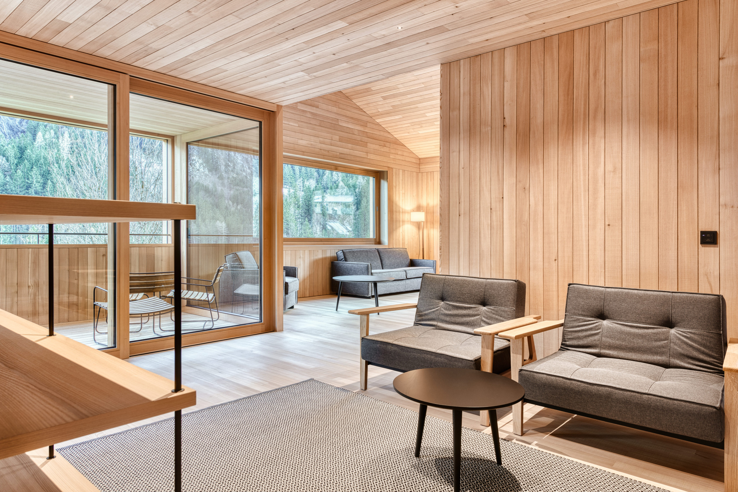 STUDA 9 offers 110 m² to breathe deeply – with plenty of space, light and a view of the greenery. The generous living feeling, two bedrooms, clear lines and high-quality equipment create a retreat for four to six people. Your private sauna and the covered loggia with a natural view make this place special – quiet, open and pleasantly personal.