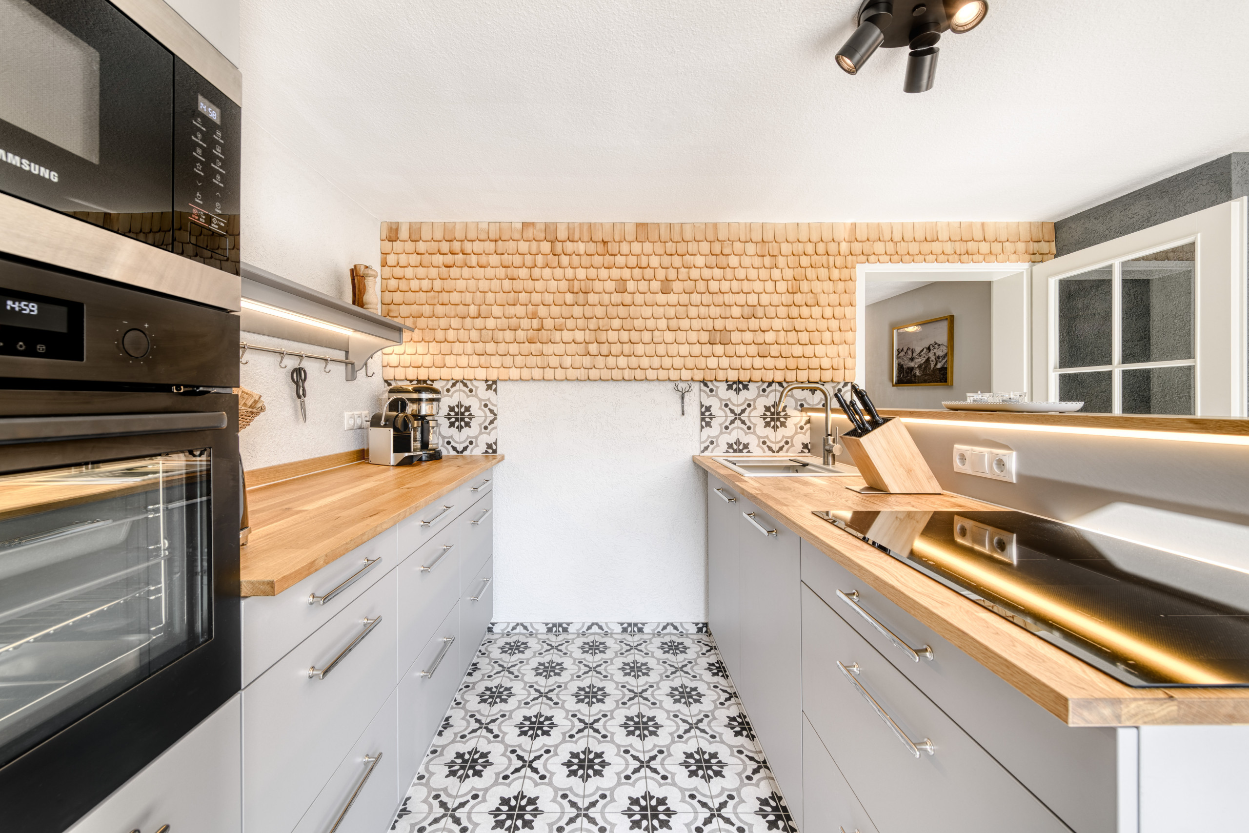 Die Küche im Erdgeschoss ist etwas in die Jahre gekommen, soll aber laut Besitzerin demnächst renoviert werden. Schade, dass der Jacuzzi nicht genutzt werden kann. Super wäre noch eine Abkühlmöglichkeit nach der Sauna im Freien, der kleine Bach nebensee more