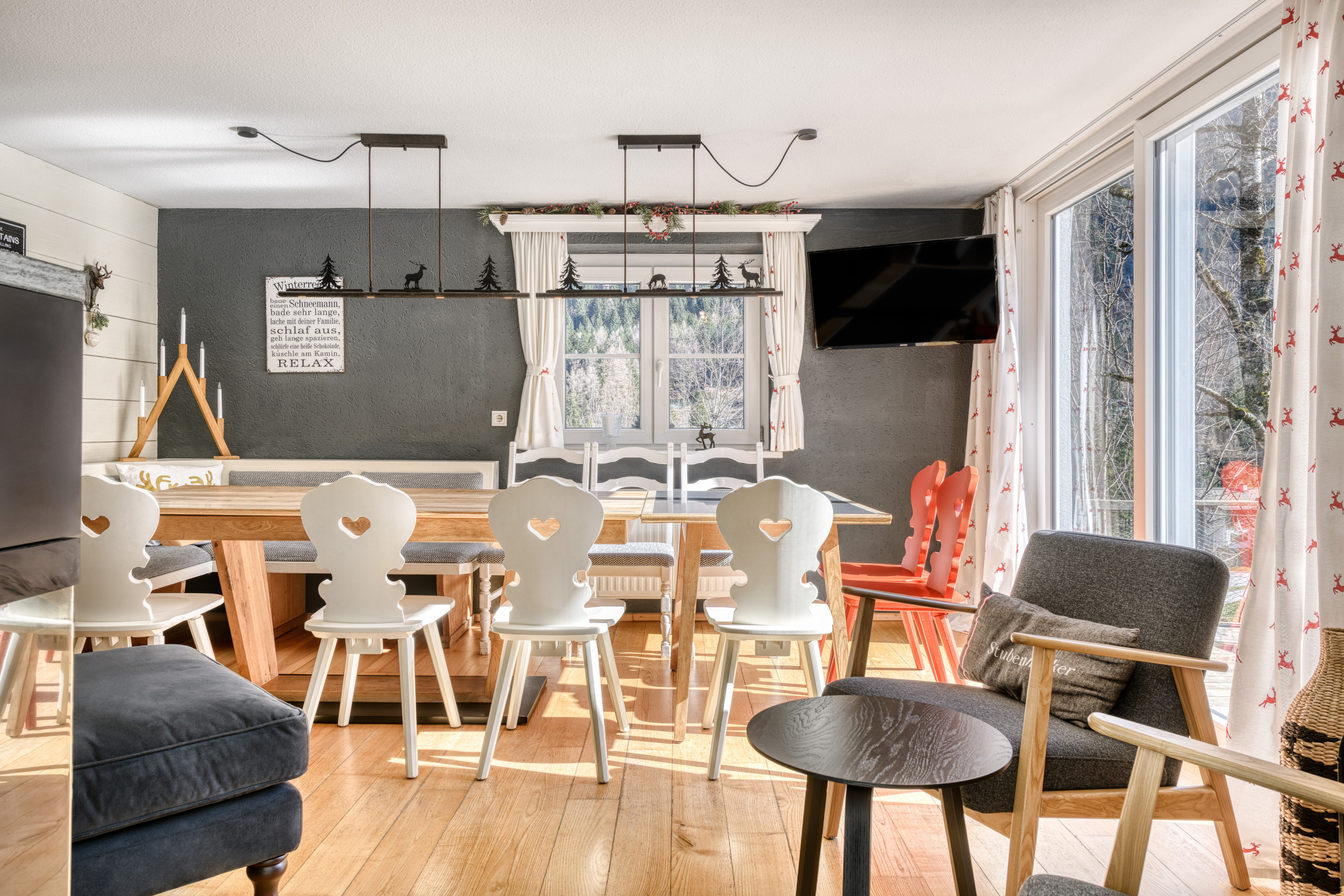 A modern dining area with two large tables invites you to enjoy dining and grilling outside. Sundowners can be enjoyed in the evening sun on the two lounge sofas and deck chairs. The absolute highlight is the Finnish sauna in the garden with a view of the mountains and the town of Brand, which guests can use free of charge.