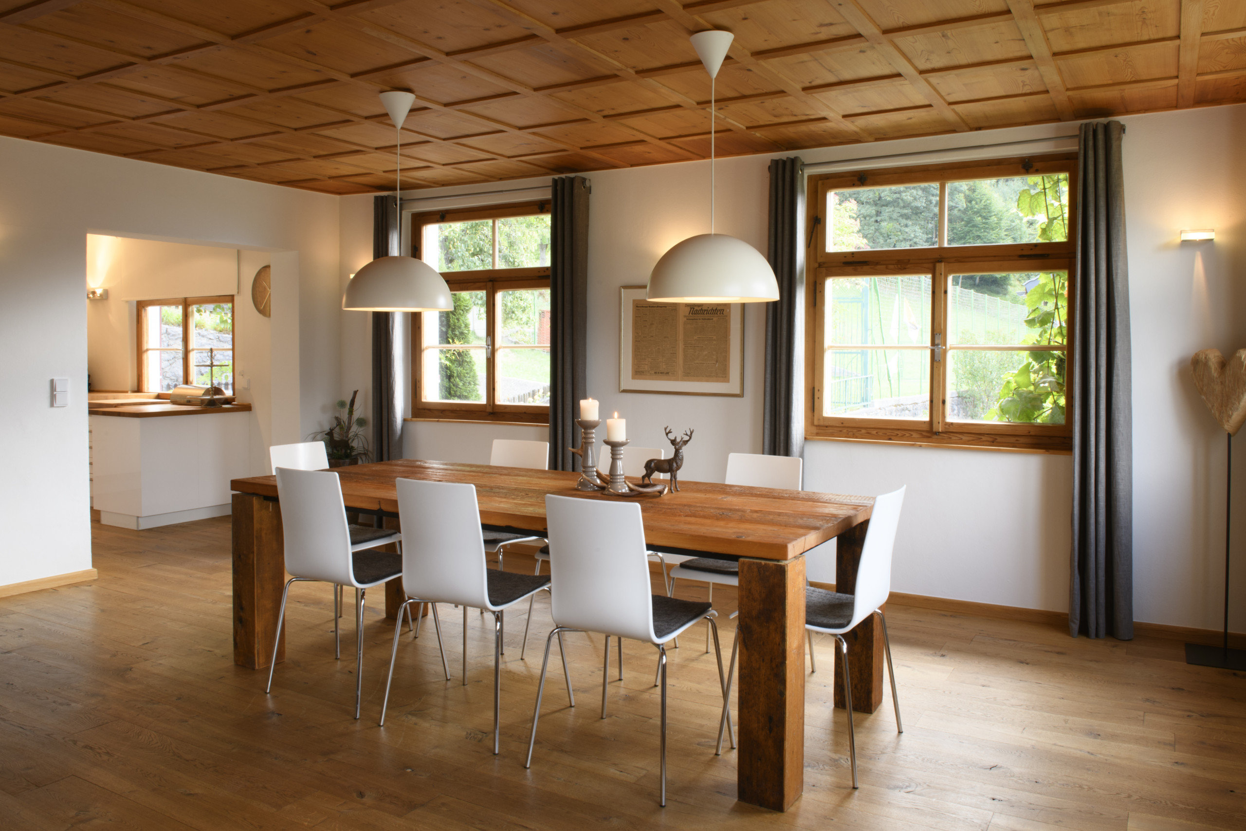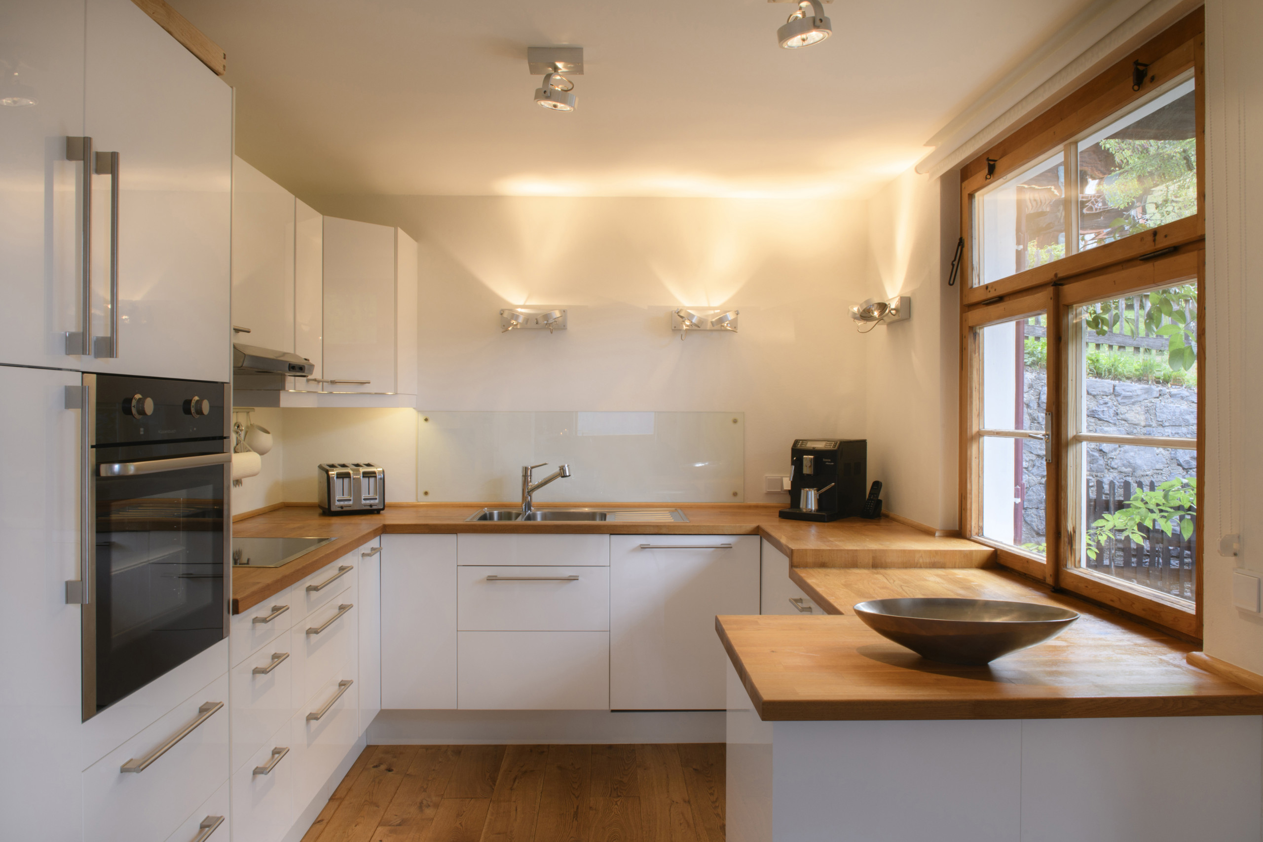 De open woonkeuken is volledig uitgerust en nodigt uit tot samen koken. De woonkamer met eethoek en traditionele tegelkachel vormt het hart van het huis – vooral na een actieve dag in de bergen. En in het souterrain wacht een kleine Finse sauna met relaxstoelen om op te warmen en tot rust te komen.