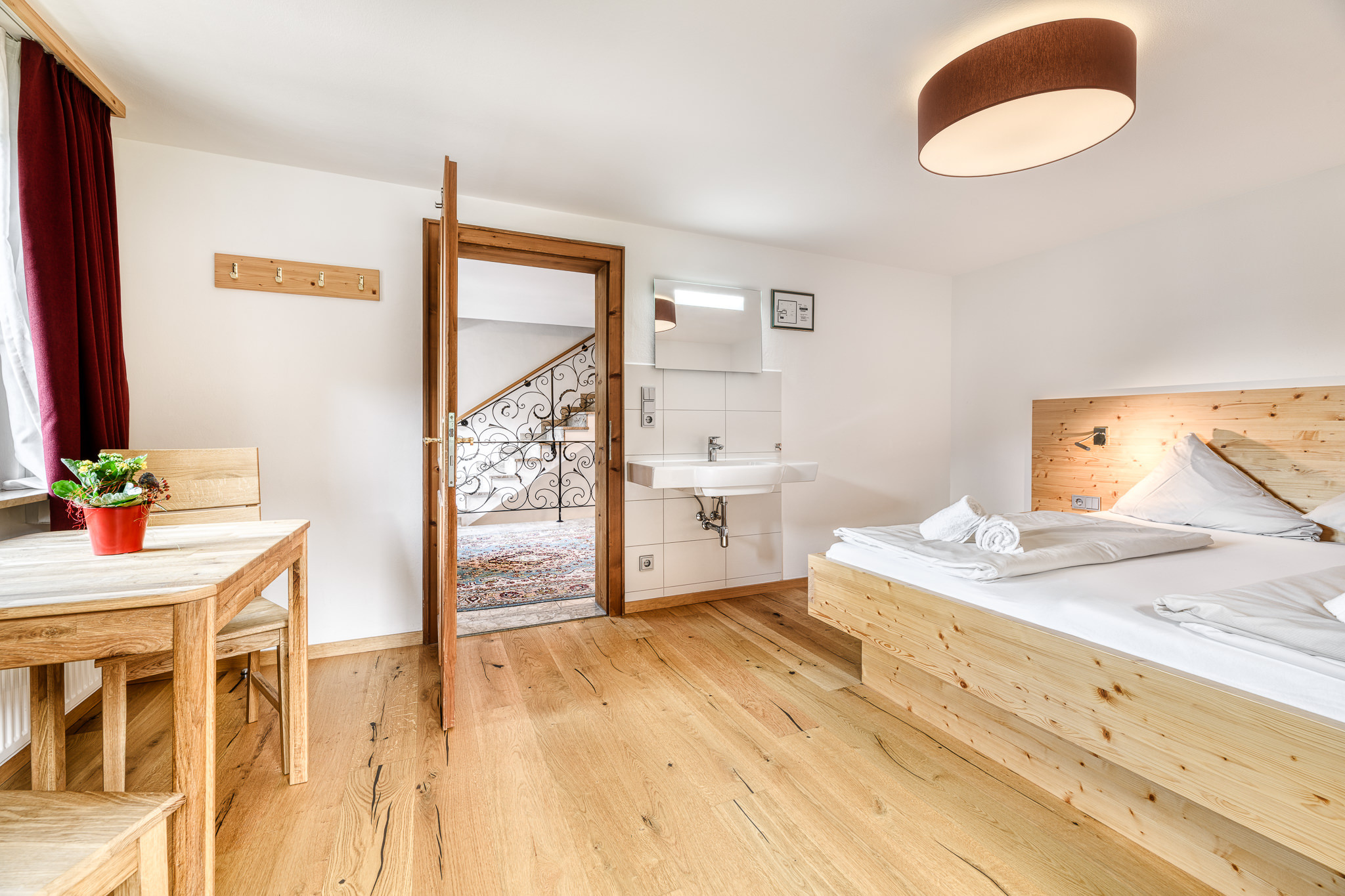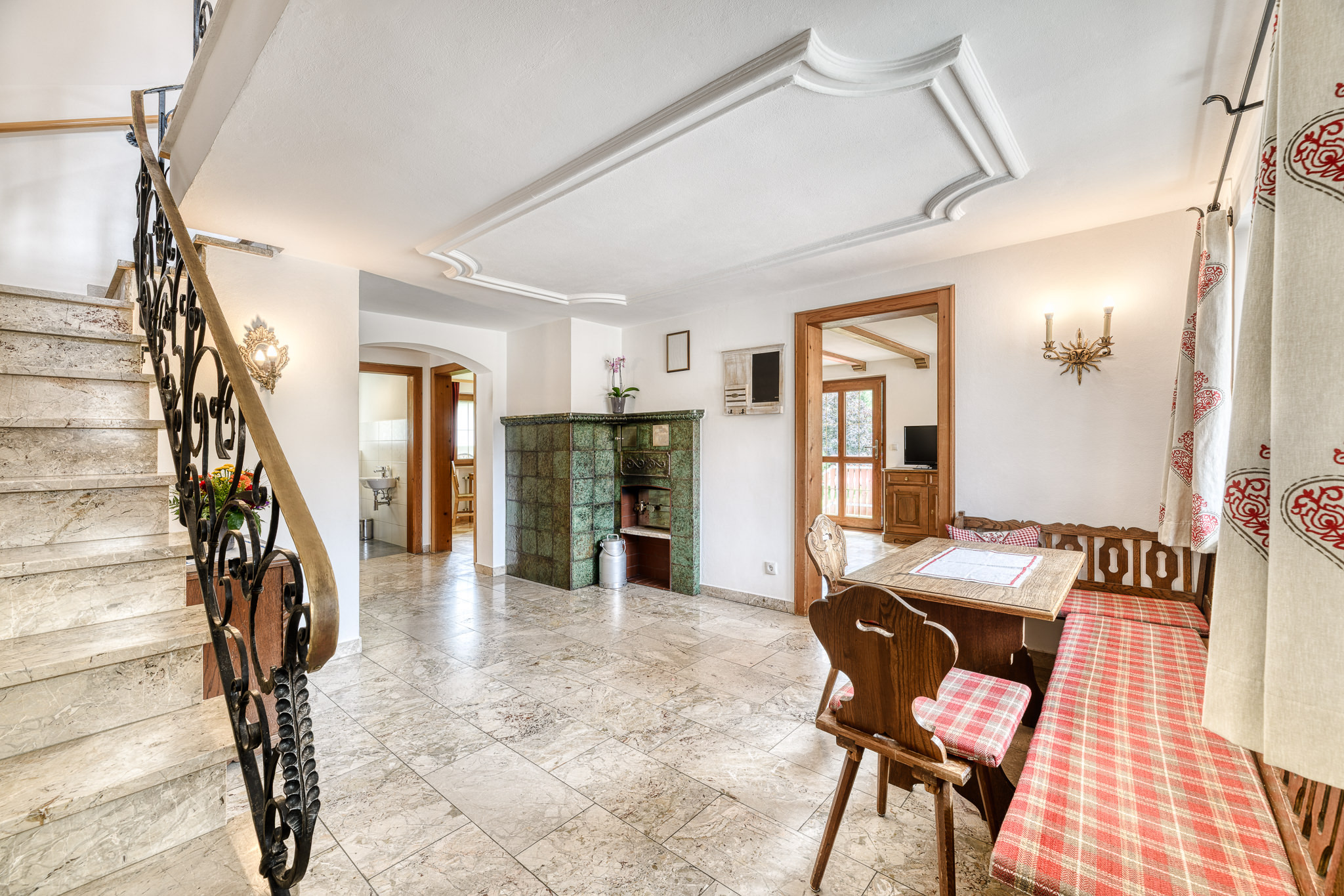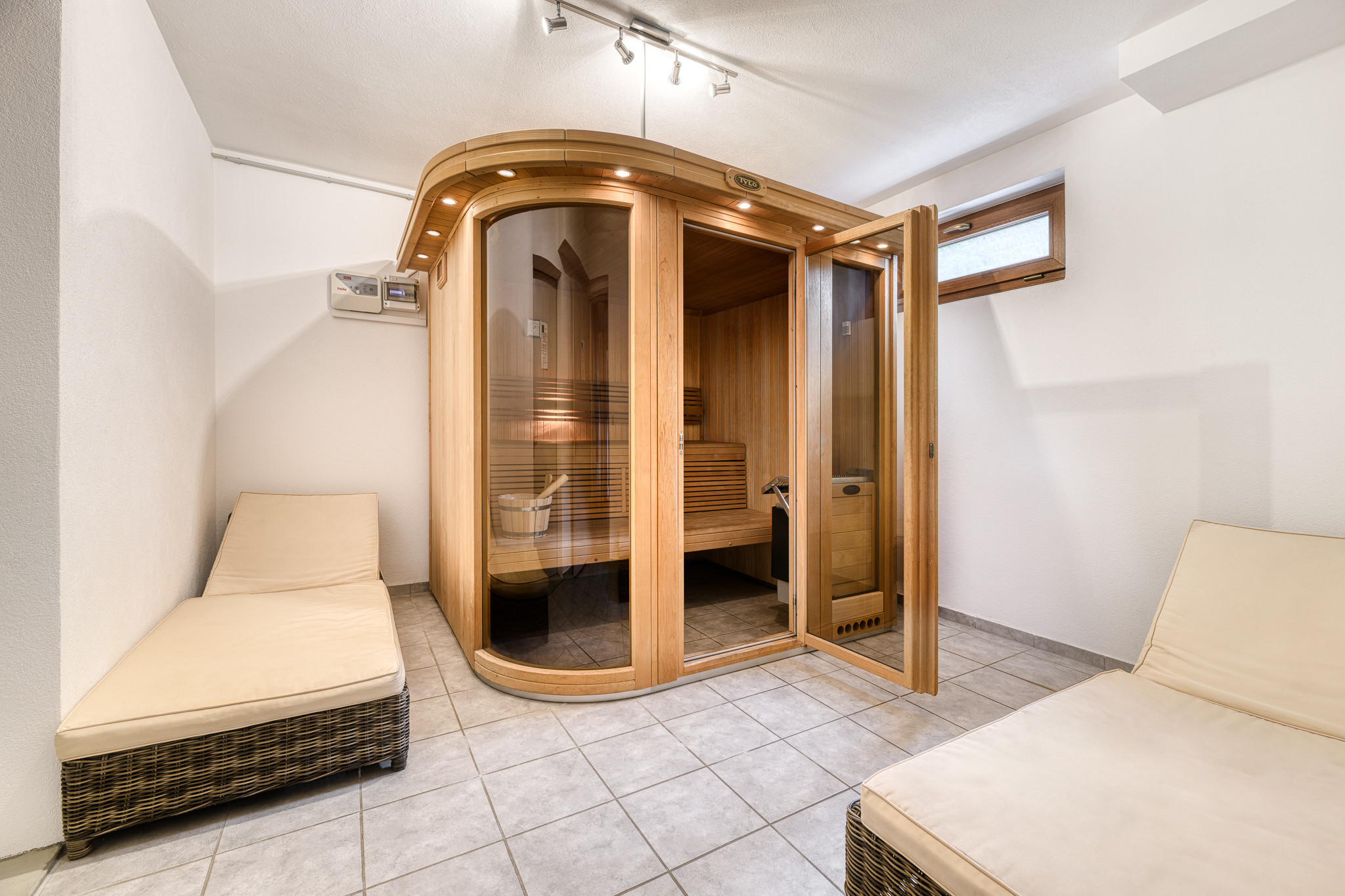 De houten betimmerde kamer met gezellige zithoek in de lichtovergoten erker nodigt uit voor gezellige avonden. In de aparte keuken met hoogwaardige uitrusting en grote eettafel wordt gezamenlijk koken een belevenis. Na een actieve dag ontspan je in de eigen sauna in de kelder.