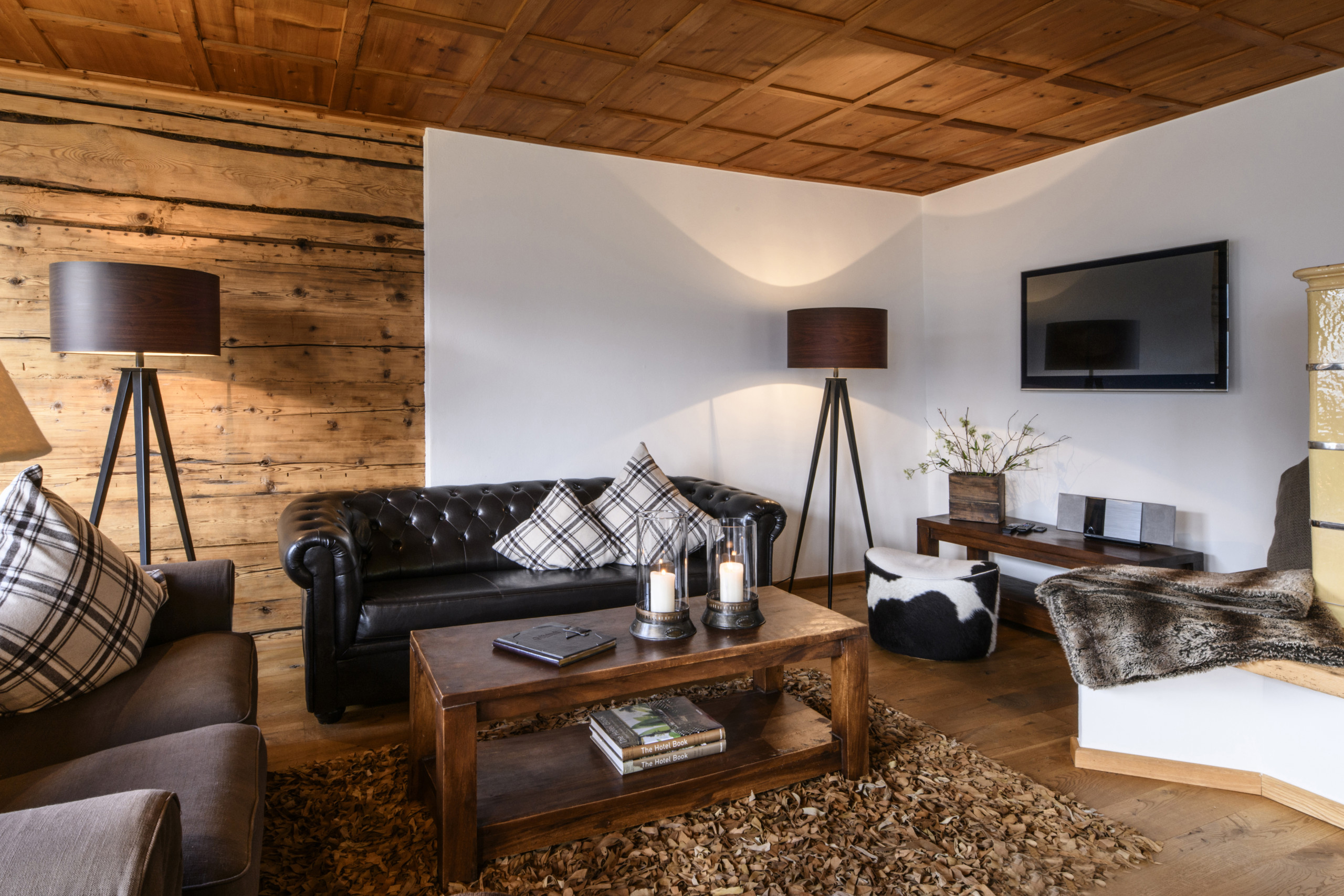 Dazu lädt die voll ausgestattete Wohnküche mit Holzdetails zum gemeinsamen Kochen ein. Der offene Wohn-Essbereich mit Kachelofen und viel Platz wird zum Herzstück des Hauses – besonders nach einem Tag in den Bergen. Im Untergeschoss bringt eine kleine finnische Sauna mit Relaxliegen Wärme und Entspannung.