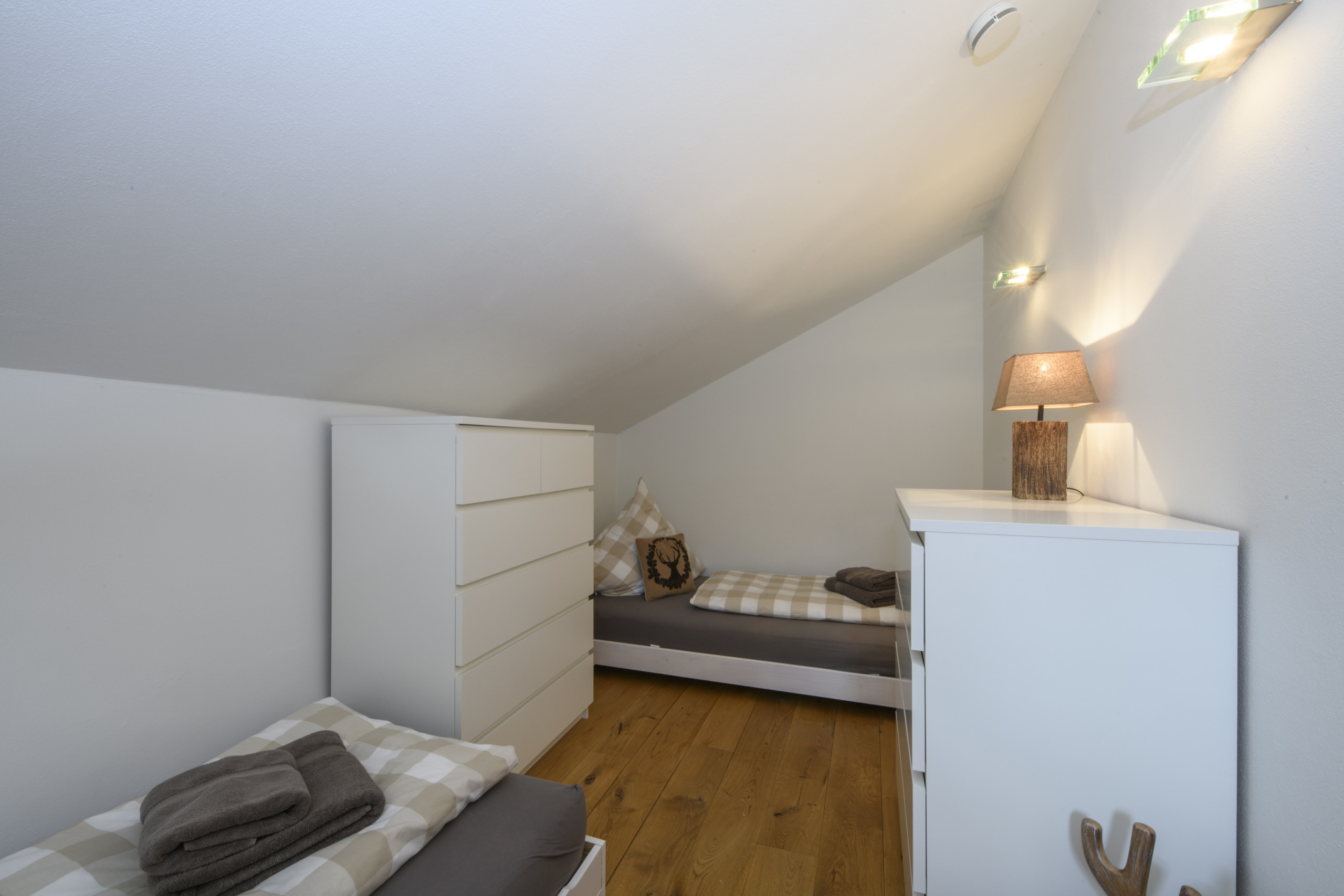 Auf drei Etagen findest du Platz für bis zu 10 Personen – mit fünf liebevoll gestalteten Schlafzimmern, die viel Rückzug und Flexibilität bieten. Im Erdgeschoss liegt ein gemütliches Zimmer mit zwei Einzelbetten, die auch zum Doppelbett zusammengestellt werden können. Im Obergeschoss erwartet dich ein charmantes Familiensetup: Ein großzügiges Schlafzimmer mit Doppelbett und direktem Zugang zu einem kleinen Kinderzimmer mit zwei Einzelbetten – perfekt für Eltern mit Nachwuchs. Zwei weitere Schlafzimmer – eines mit Babybett, das andere mit Zusatz- oder Kinderbett sowie Balkon – runden das Raumangebot ab. Warme Farben, natürliche Materialien und sanftes Licht schaffen in jedem Raum eine beruhigende, alpine Atmosphäre.