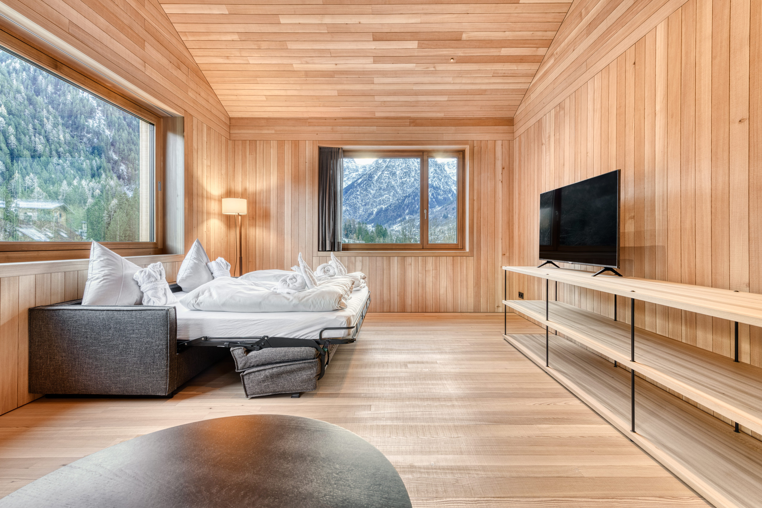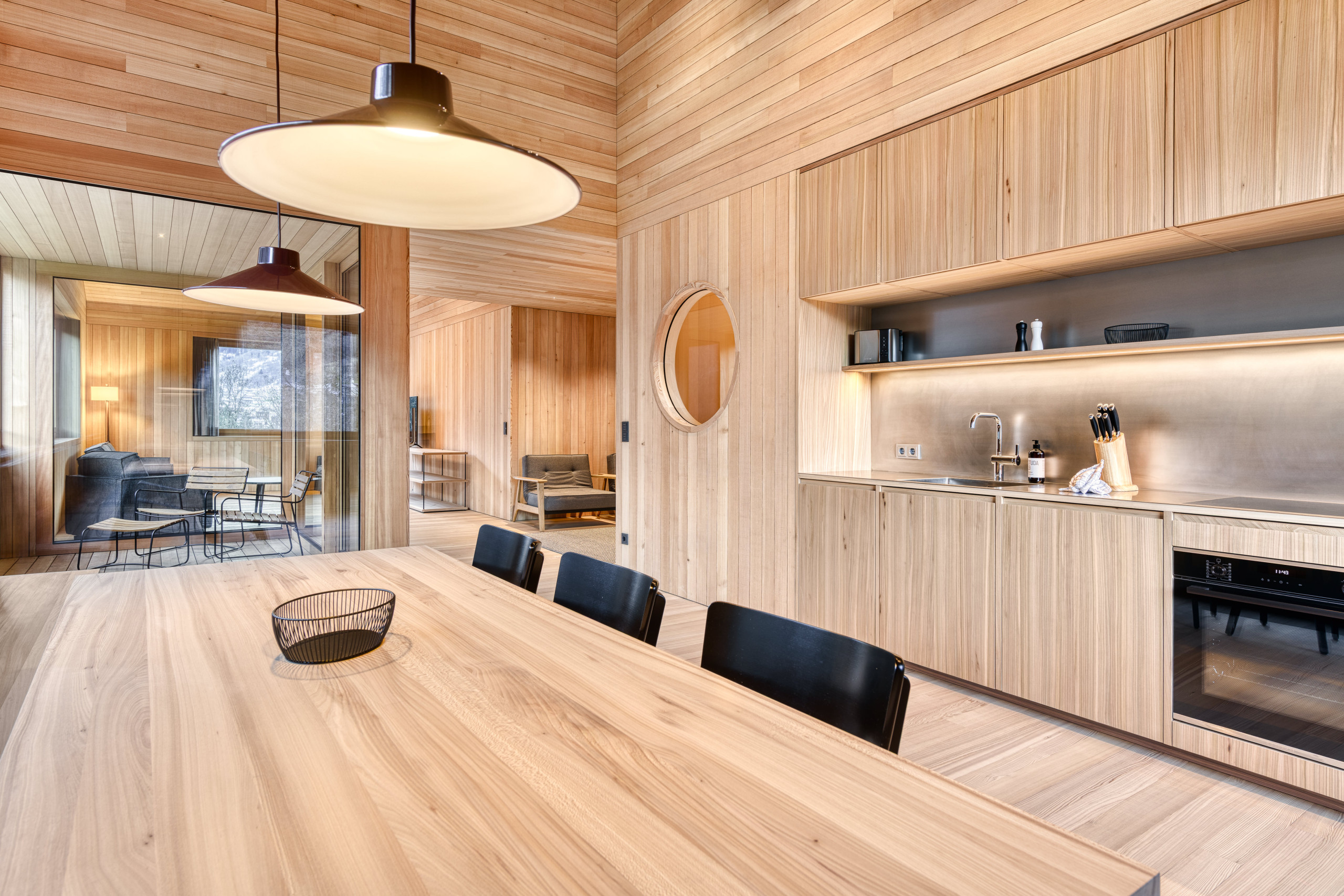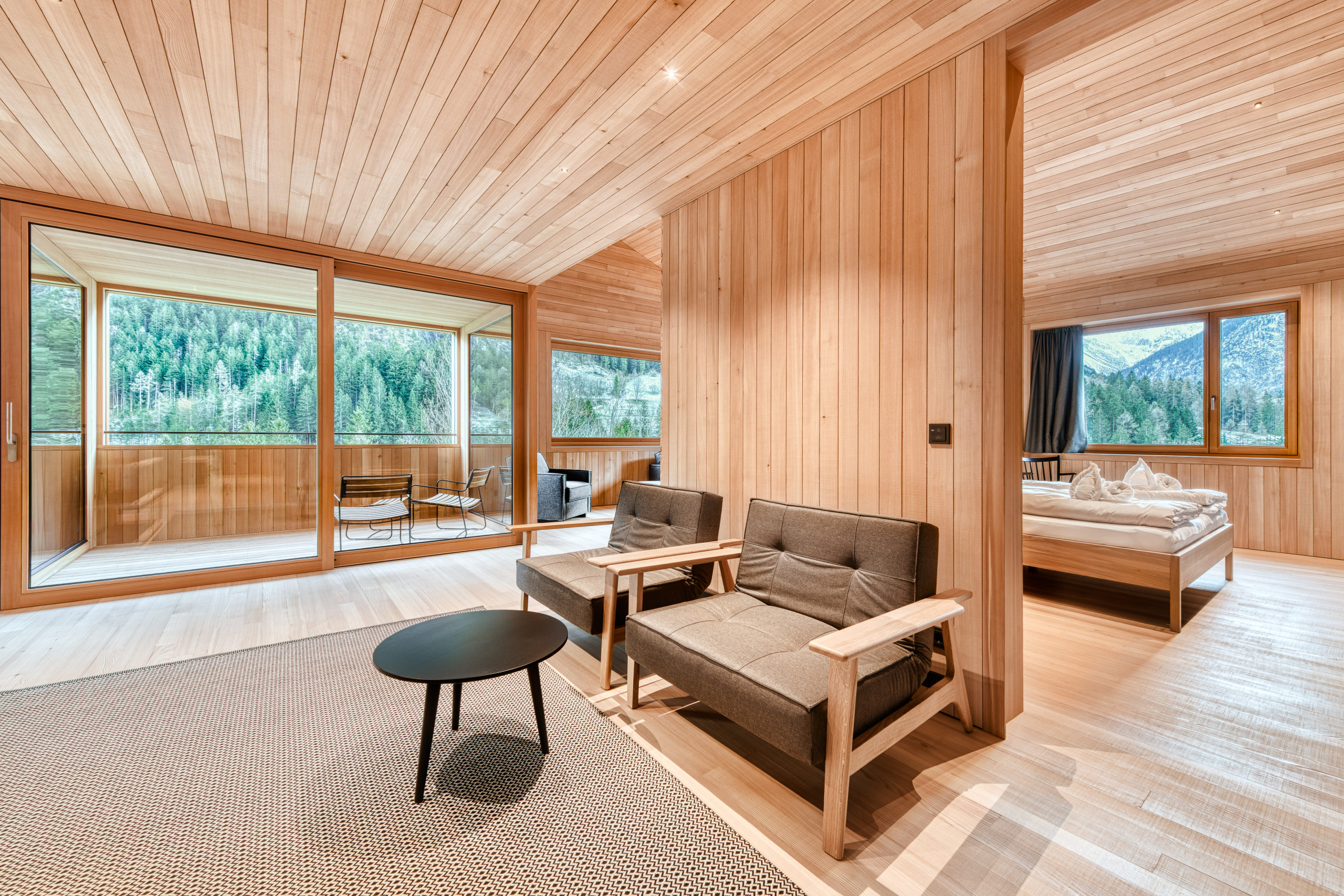 STUDA 9 bietet 110 m² zum Durchatmen – mit viel Raum, Licht und dem Blick ins Grüne. Das großzügige Wohngefühl, zwei Schlafzimmer, klare Formen und hochwertige Ausstattung schaffen einen Rückzugsort für vier bis sechs Personen. Eure private Sauna und die überdachte Loggia mit Naturblick machen diesen Ort besonders – ruhig, offen und wohltuend persönlich.